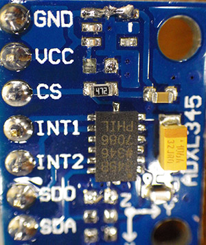 I almost forgot… for those of you wanting to build one of these drip sensors, the ADXL345 was one of the cheep boards from eBay . When all you want is tap sensing, things that the clone boards are notorious for like offsets, drift, etc. don’t matter that much. Most of these breakouts come with a voltage regulator already installed, but since I was driving the I2C lines from the pro mini, which already has a 3.3v regulator, I had to de-solder the vReg (& its isolation cap.) from the breakout board and then bridge the vcc line straight across. (see top) And since I2C lines are running through the RTC breakout , they already have 4.7kΩ pullups on them, so I also had to lift the little smd resistors from the accelerometer breakout board. You can see the empty solder pads, just below the chip in the photo.