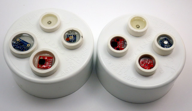 After building a few more of these I ran into a problem with epoxy wicking into the RH sensors before it cured. This is impossible to see under that SF2 protective cap so the only option is to drill out the bad sensor the next day. To prevent this from happening again, I now pot the RH sensor without the caps, and then tack the cap down with plumbers putty after the epoxy is dry:
