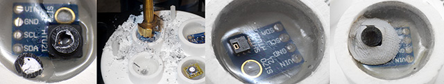 The pass-through wires push the breakout boards into odd angles, so I tack them down with a pea-sized bead of JB Plastic Weld while applying some top pressure to hold the board level. (takes ~15 minutes) Then I test the sensors “dry”, while they can still be removed. Potting in epoxy is the last step.