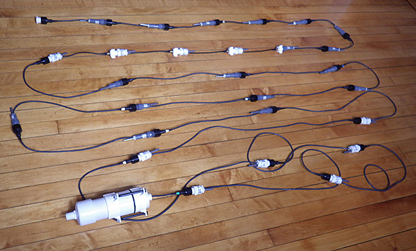 Cave Pearl Project DIY Temperature Sensor Chain using one-wire ← Previous Next → This chain is 13.5m long, with 27 nodes (1m, 0.5m and 0.25m lengths) DS18B20 Temperature sensor chain prototypes using DIY underwater Cave Pearl data logger.