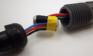 DS18B20 Temperature sensor chain prototypes using DIY underwater Cave Pearl data logger. These deans style connectors fold neatly into the gap in the gray adapter.