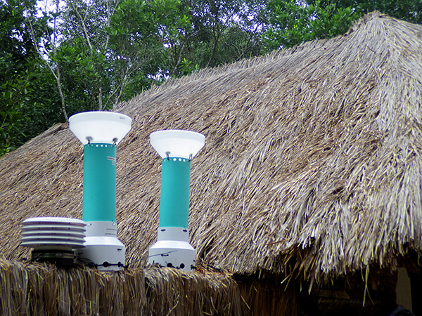 We wrapped up the day by putting the new logging rain gauges on the roof of a building, beside our solar shielded pressure/temp/r.h. sensors. My hope is that those funnels give us a more quantitative record from the little drip sensors in the base, in addition to protecting them from that merciless tropical sun.