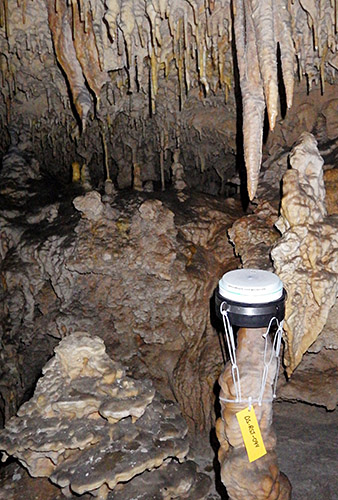 Once we had the new toys in place, we could finish placement of the drip stations. A couple of the older stations suffered repeated knock-overs, so we decided to relocate those. One of the new sites was near a beautiful pancake-stack formation, but it only had a 12cm drip fall. That’s a very small amount of kinetic energy for my sensors to detect, and I watched this unit for 30 minutes to make absolutely sure the logger was picking it up. Though the drips made no sound at impact, the indicator LED was piping OK.