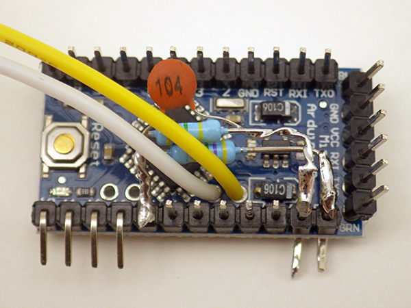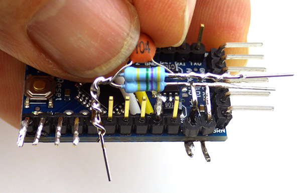 7. First solder the middle of the divider securely to pin A0. With that A0 connection in place, bend an ‘L’ into the lone resistor leg so that it lines up with the vRAW pin you bent and tinned earlier (ie: the one closest to the serial i/o pins). Try to get this connection fairly close to the Arduino board to make some room for the ground connection which will go above it. Then do the same procedure for the combined cap/resistor pin, soldering that onto the ground line riser pin. After the solder joints are in place, trim away the excess wire leads, being careful not to accidentally cut the riser pins.