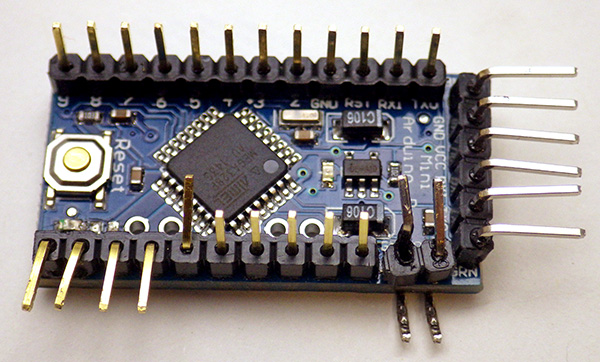 3. At this stage it makes sense to bend and add solder to several riser pins. Bend digital pins 10-13 away from the main board for later connection to the SD card wires. Bend pin A0, RAW & GND pins in toward the processor so that the battery voltage divider can be located above the board.