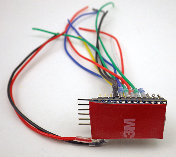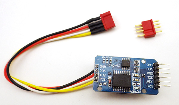 2. The I2C lines that we will attach to one side of this breakout board are provided on cascade connectors on the other side of the board with 4.7k pullup resistors already installed on the SDA and SCL lines. To that cascade connector solder 4” lengths of Black, Red, White, and Yellow wire on the GND, VCC, SDA, SCL respectively, so that they emerge the battery side of the board. Leave a few mm of wire protruding from the solder joins, as these provide convenient attachment points for an I2C EEprom if you wish to add that later.