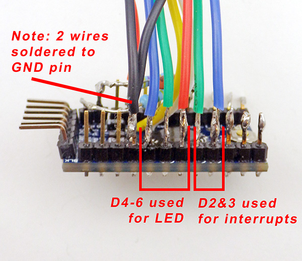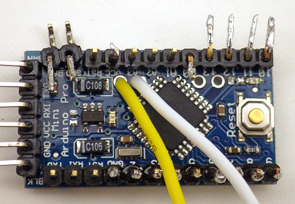 5. A4 & A5 are needed for the I2C bus, but on pro-mini style boards these are somewhat inconveniently located wrt the voltage divider we use to monitor the main battery status. Soldering a white jumper wire directly to the board at A4, and a yellow jumper wire to A5 allows us to breakout these connections. I usually strip, twist & pre-tin the wire ends before putting then through the board for these connections. Otherwise a stray bit of wire might not make it through the hole, and cause bridging problems.