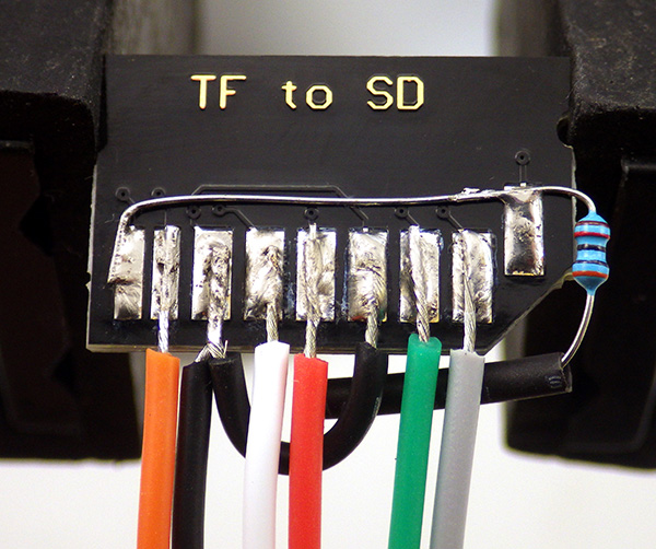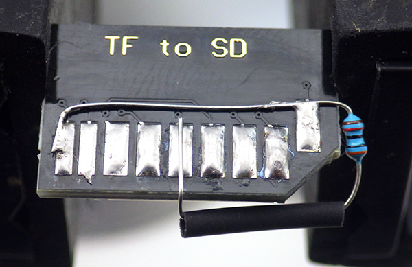 Here is an example of the SD adapter modified with 30K pullups resistors on CS, MOSI & MISO. I used 1/8 watt metal films because their small size makes it easier to squeeze them in
