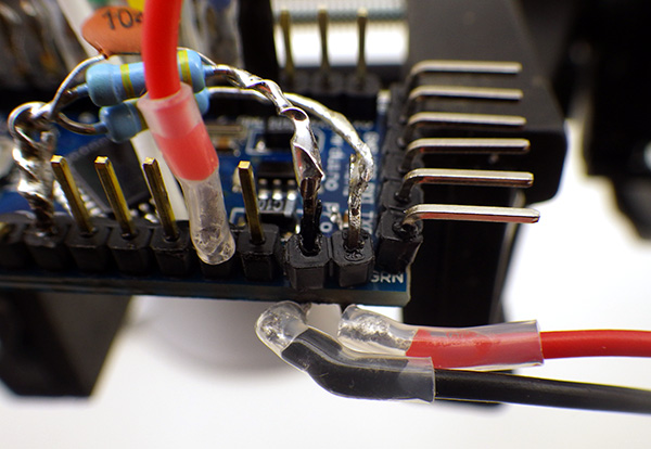 It is very important that there is an air gap between the RAW & GND leads of the voltage divider (on the right hand side), so that they DO NOT MAKE CONTACT with each other. This would short out your power supply! It might be a good idea to put some heat shrink in there too.