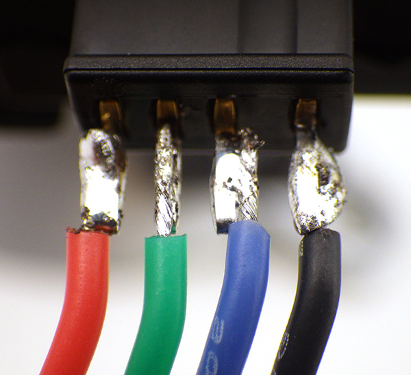 12. Trim the LED wires to the same length. Strip and Tin the ends, then solder those the ends to the female side of a black WSD1241 Micro 4B plug in the order R,G,B-GND (with ground on the dimpled side of the connector).