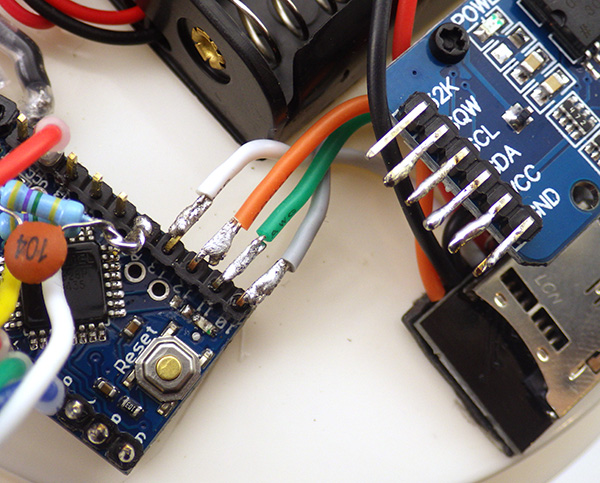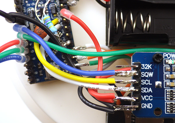 Repeat this process for the (yellow) SCL wire from A5, and connect the (blue) interrupt pin 2 wire to the RTC pin labeled SQW.