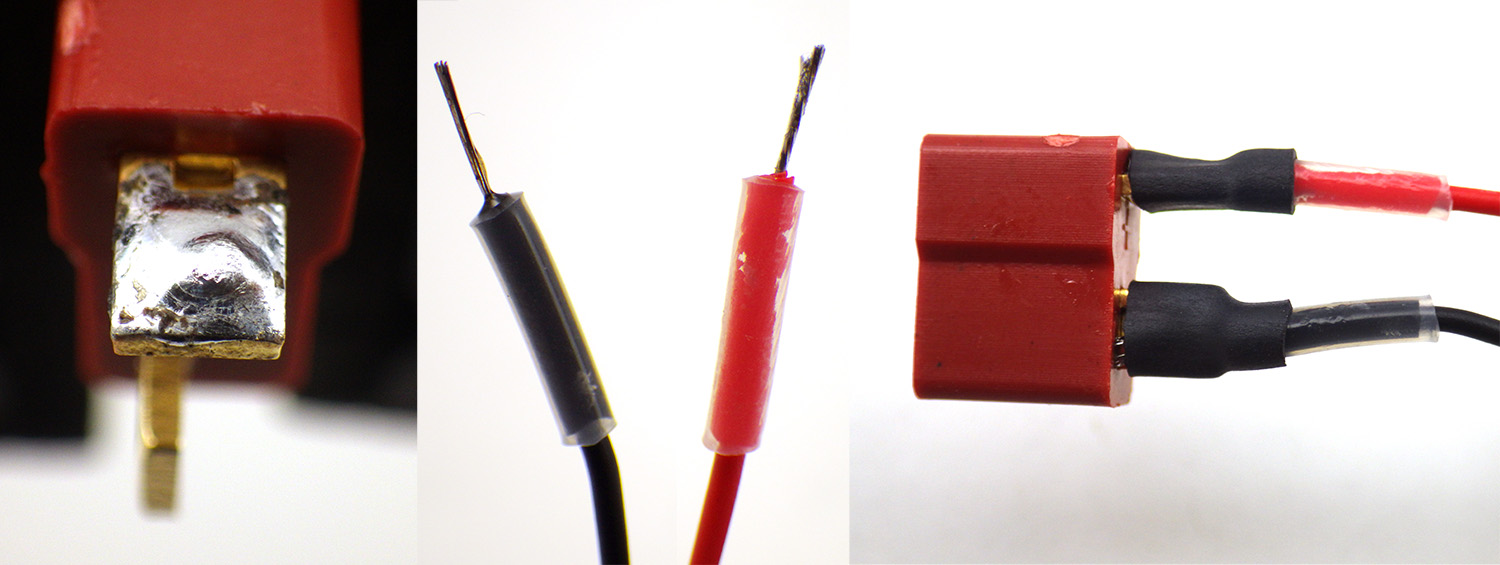 13. The final step on the main platform is adding connectors to the battery holders and the Arduino input leads. Start by trimming the battery leads to a position about ½ way across the battery holders. These wires are can be fairly thin so reinforce their insulation with a few layers of heat shrink before trying to solder them to the pre-tinned battery connector posts. Before soldering these beefy connectors make sure the male side has been inserted so that the nylon does not soften and let the metal contacts inside shift around when you are applying heat. They really get hot during this process!