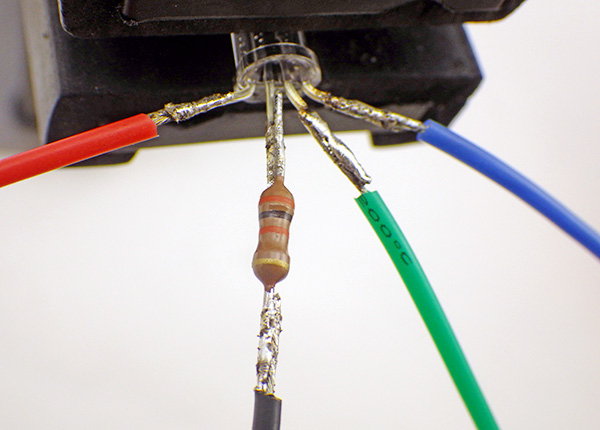 2. Trim and add a 30 K ohm limit resistor to the GND line. On some RGB LEDs, green is 2-3 times brighter than the other colors, so you can add a second 20-30K ohm resistor to the Green LED line if you power budget is tight, although this will make the green indicator hard to see in full sunlight.