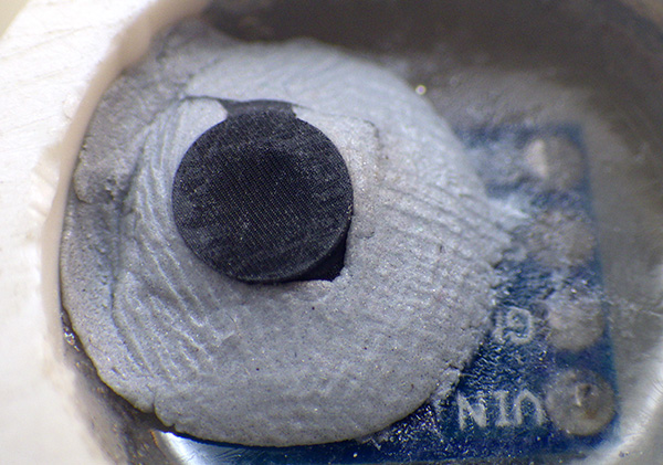 You must be careful not to spill any epoxy onto those sensor areas or they will be ruined! Fill the sensor wells with epoxy VERY slowly from the bottom and stop when the epoxy just covers the top edge of the sensor breakout board. Sometimes it is helpful to use a thin wire to paint the epoxy over the soldered breakout board traces while avoiding the sensor itself. The image above is from a HTU21 RH sensor and gives some impression of how tricky this can be to do well. That sensor is approximately 3 mm per side. If any epoxy had entered the small exposed hole at the center of the chip the RH sensor would have been destroyed. (yes, I have lost a few…) Some sensors also require a covering cap, and it is generally easier to use plumbers putty to affix these protective fabric caps into place after the epoxy has cured, rather than trying to do sub-millimeter adjustments with liquid epoxy.