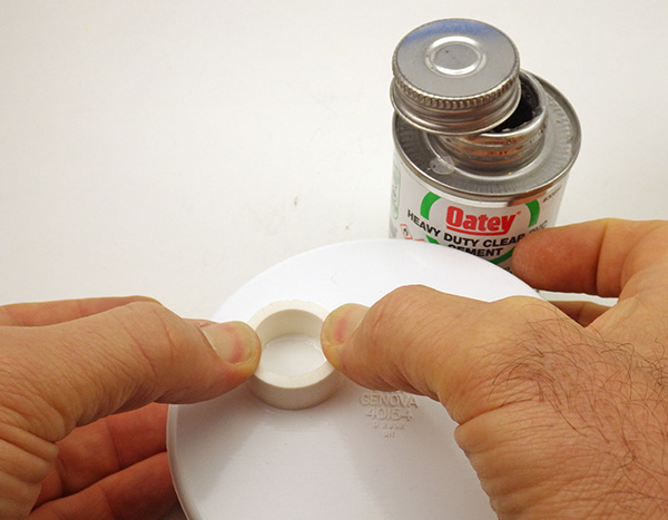 3. Clean both surfaces, and give the two surfaces that will be brought together a light coating with clear pvc primer, then put a thin bead of pvc cement on the lower surface of the pvc ring and bring it into contact with the previously primed area on the large end cap. It is important that you use ‘just enough” of the primer and pvc cement to bond the rings. If you apply more than a thin bead, the solvent will fail to bond.