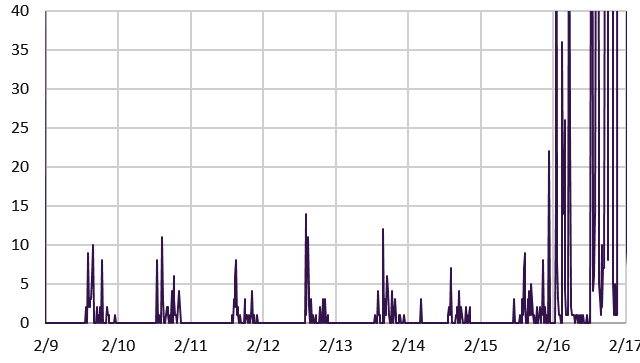 The drip counter inside the rain gauge is essentially using it’s accelerometer as a vibration sensor, which gave us in-cave sensitivity down 12cm drip-fall distances. So it probably should have occurred to me that we needed to reduce the sensitivity for surface applications. The daily noise is pretty easy to threshold away in Excel with an if statement [ =IF(DataCell-threshold<0,0,DataCell-threshold) ] and different settings showed that the typical daily ‘background noise’ was adding about 10%. I’ve even heard that funnel wetting & other losses cause cheap rain gauges to under-report by that much, so this daily bump might come out in the wash. A thornier problem lies with the ‘windy day’ events, which produce the larger spikes. And that effect is probably embedded in the rain storm data as well. Though with ~10 drops counted per mL of water through our funnel, actual rain events usually count up into the thousands. So I can apply pretty aggressive filtering (with thresholds around 200) and doing so hints that the stronger wind events are probably adding another 20% to the overall totals. I know that’s sounds pretty bad, but hey – it’s a prototype right?