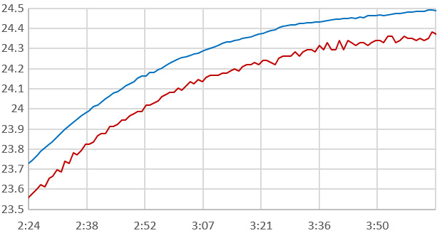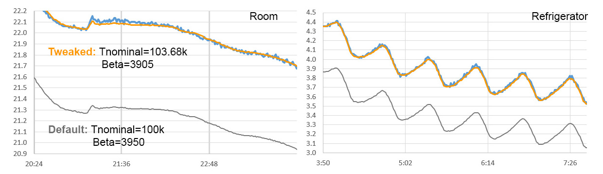 So in my early tests, all I had to do was adjust those two constants until the thermistor readings fell right on top of the reference line. Easy-peasy!
