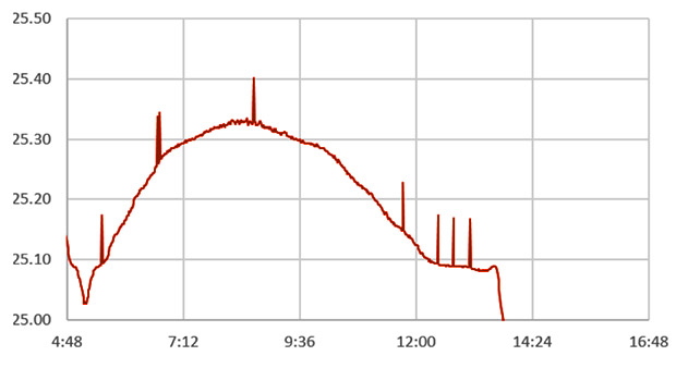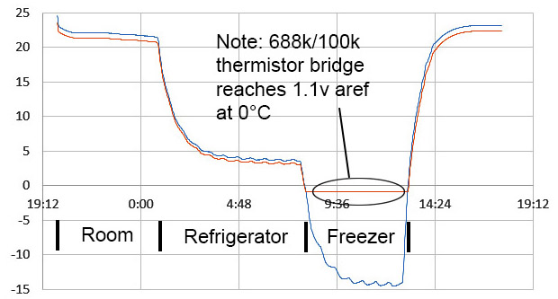 and strange artifacts started appearing in the log. The voltage readings from both the main battery and the RTC backup battery were rising when the units went into the refrigerator, and this didn’t seem to make sense given the effect of temperature on battery chemistry: