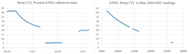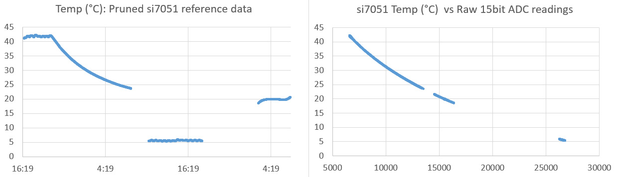 To find out, I needed to prune away the negative temperature regions where the voltage divider had flat-lined, and remove the rapid transitions since the thermistor responds to changes more quickly than the si7051: (click image to inflate)