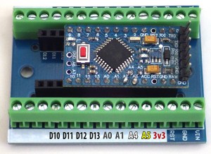 NOTE: The Screw Terminal board we use in this build was designed for the 5v Arduino NANO, so the shield labels don’t match the actual 3.3v Pro Mini pins on the ‘analog’ side. (the digital side does match) To avoid confusion may want to tape over those incorrect labels and hand write new labels to match the pattern above. Wire connections in this tutorial will be specified by ProMini pin labels: D10-13 are used for the SD card, A4=A2 is the I2C Data line, and A5=A3 is the I2C clock line, A0 & A1 are not used.