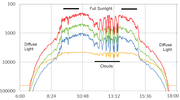 Red, Green & Blue channel readings over the course of one day from the indicator LED in the logger photo above. The yellow line is from an LDR sensor the same unit, that was over-sampled to 16-bit resolution. The LED sensor has a logarithmic response and the left axis on the graph is a time- based measurement where more light hitting the LED sensor results in a lower number. Note how the RED signal changes more quickly than Blue & Green at sunrise & sunset. LED’s work well with natural full-spectrum light, but their limited frequency sensing bands can give you trouble with the spectral distribution of indoor light sources. The peak spectral response of LED’s is usually around 30–50nm lower than their peak emission wavelength So the blue channel is actually recording in the near-UV range, the Green channel is responding at ~ 420nm (blue) and the red channel is actually responding to a wide band of yellow-green light.