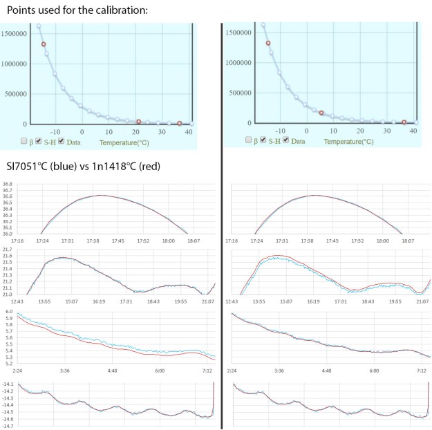 Comparison of si7051 reference temps (blue) (°C) vs 1n1418 based S&H calculations (red) Two examples shown with different ‘center’ points (21°C on the left & 5°C on right) used to generate the three equation constants.