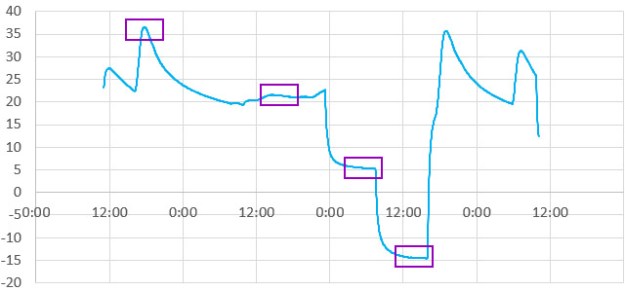 Typical SI7051 (±0.1°C) reference temperature run for calibrating the 1n1418 diode. Boxes indicate plateaus chosen for the calibration data points & coverage areas of closeup graphs shown in the ‘sets’ comparison below.