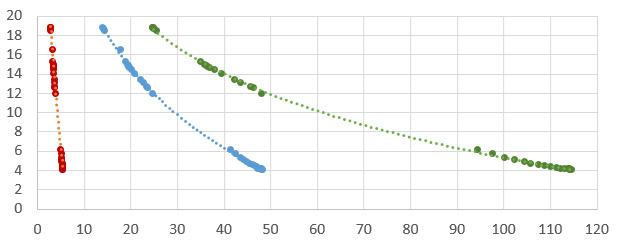 Temperature (°C) vs 1n5819 Shottky Reverse-bias Leakage Discharge Time (8 mHz clock cycles) Diode connected between D7 & ICU on D8. Blue dots are Excel’s trend-line. That fit was better than I was expecting.