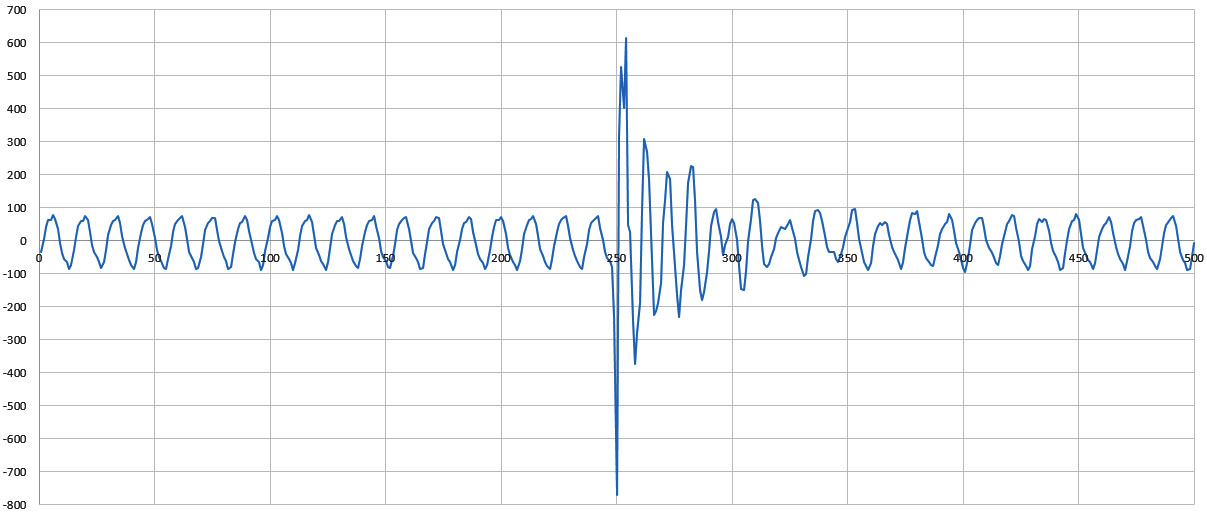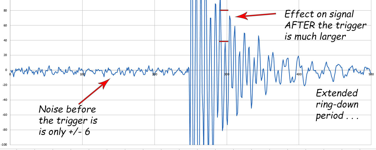 A dramatic improvement, with the ‘pre-event’ noise falling below +/- 10 counts. Most of our field deployments are in caves and this ADC looks like it has an acceptable noise floor for work in that kind of isolated environment . But the project also has a teaching component so I’d also like to use this ADC module in classroom settings. Zooming in on that last graphs shows that working with tiny sensor signals will be challenging if we are anywhere inside a building – even if the resting state of the system looks OK: