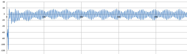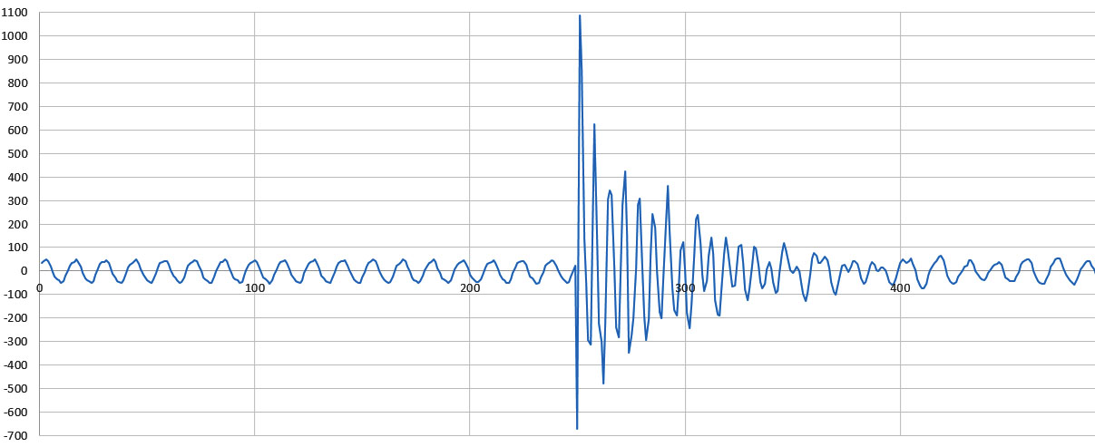 Once the sensor is set in motion, even tiny interferences from the mains will reinforce each other before the system settles again. Even if I use internal timing control to synchronize the readings with a whole number multiple of the mains, it looks like I still won’t be able to use the ‘before’ data to fully correct the ‘after’ effects. This might be specific to way piezo sensor’s resonate, but I’ve got some homework to characterize the effect before we start building a student lab with this module.