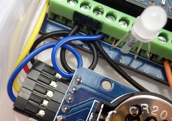 2020_FinalAssembly_5_RTCalarm_600pix ← Previous Next → Connect the black wire to the re-purposed RST=GND, and the blue alarm wire to the D2. Leave some spare wire in loops to for strain relief.