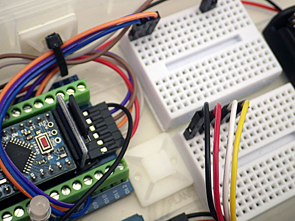 2020_FinalAssembly_8_2ndMount&breadboard_600pix ← Previous Next → Loosely tie the existing terminal wires to the back mount, a second cable tie mount near the terminal board and the second mini breadboard.