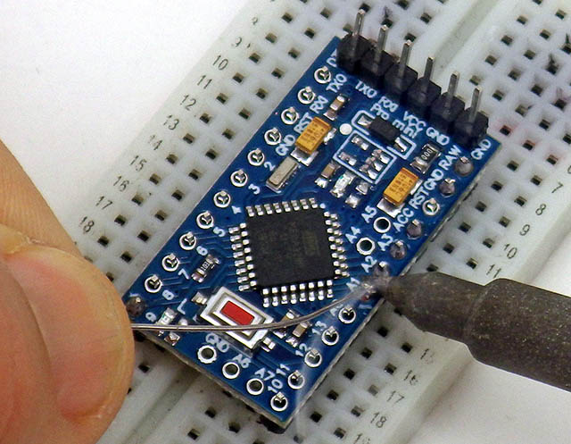 Cave Pearl data loggers ← Previous Next → Add header pins to the sides of the Pro Mini, but do not solder the two RESET pins.