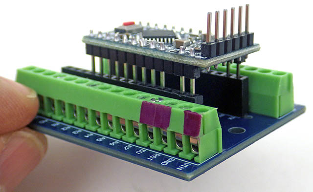 Cave Pearl data loggers ← Previous Next → Gently rock the Pro Mini back to front (holding the two short sides) until the pins are fully inserted. Some ST shields have mis-aligned headers so this insertion can be tricky.