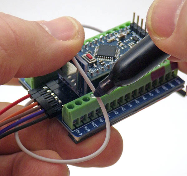 Cave Pearl data loggers ← Previous Next → Bend the long dupont jumper wires into place, mark the needed length and trim the wires leaving about 1cm of wire to fit under the terminals.
