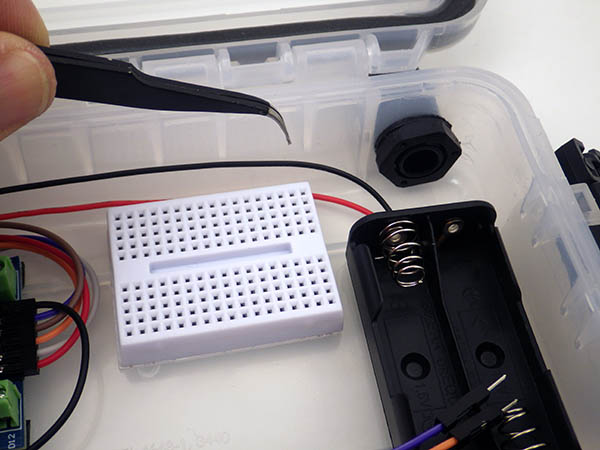Cave Pearl data loggers ← Previous Next → Add the first mini breadboard so that it’s rear right edge aligns with the second rear support strut on the housing.