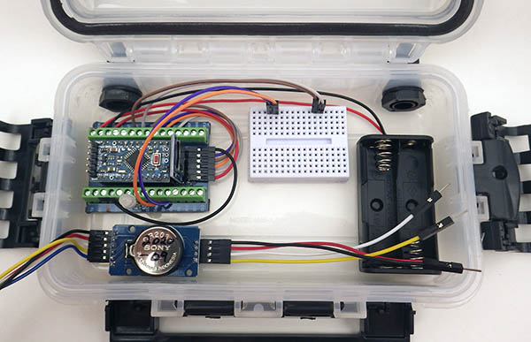 Cave Pearl data loggers ← Previous Next → Connect the stack jumper out of the way on the breadboard to keep them out of the way & attach the RTC module on the left side just below the screw terminal stack.