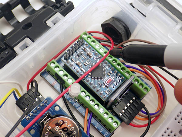 Cave Pearl data loggers ← Previous Next → Measure, mark and trim the Red=power, White=I2Cdata, and Yellow=I2Cclock wires to their connection points on the screw terminal shield