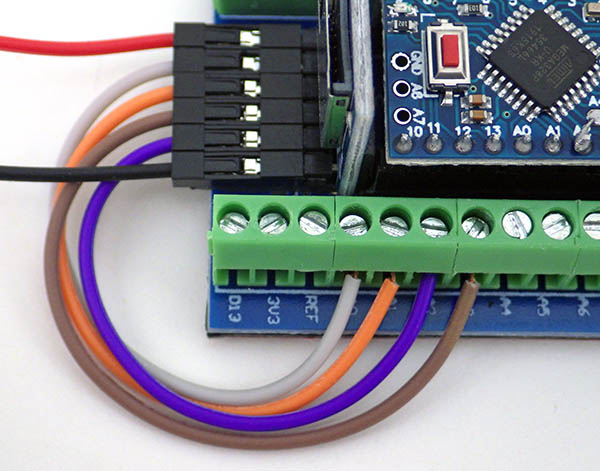 Cave Pearl data loggers ← Previous Next → SD Connection pattern: Grey (CS) to ProMini D10, Orange (MOSI) -> pm D11, Purple (MISO) ->pm D12, Brown (CLK) -> pm D13 (NOTE the shield labels say A0-A3 which do not match the D10-13 pattern of the Pro Mini pins)