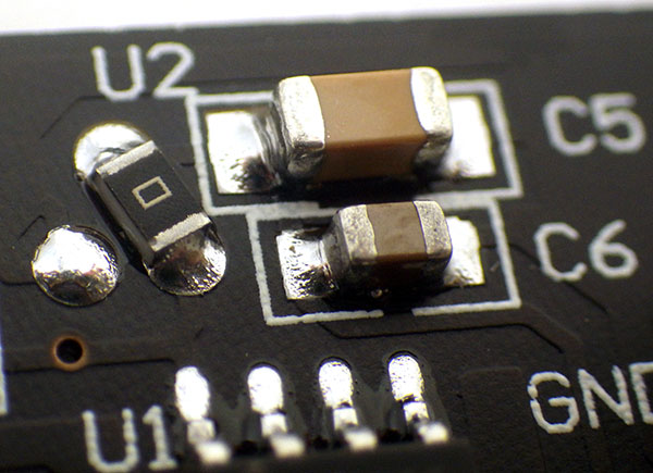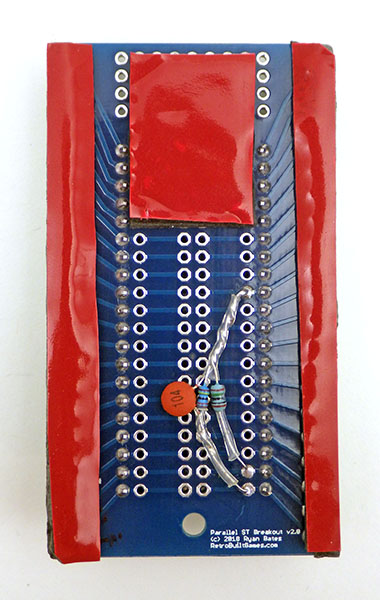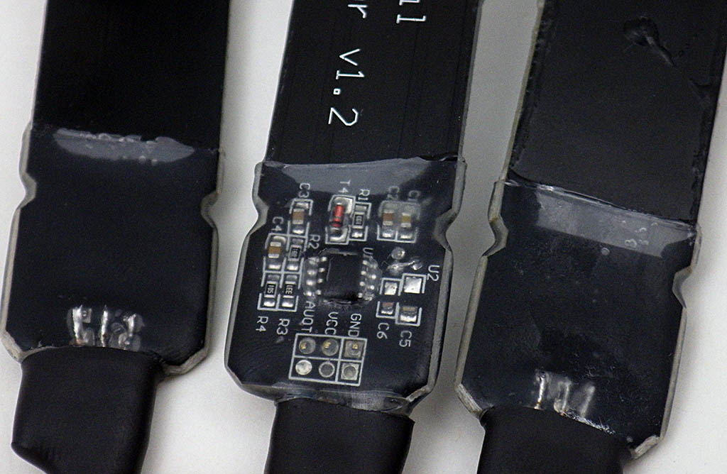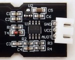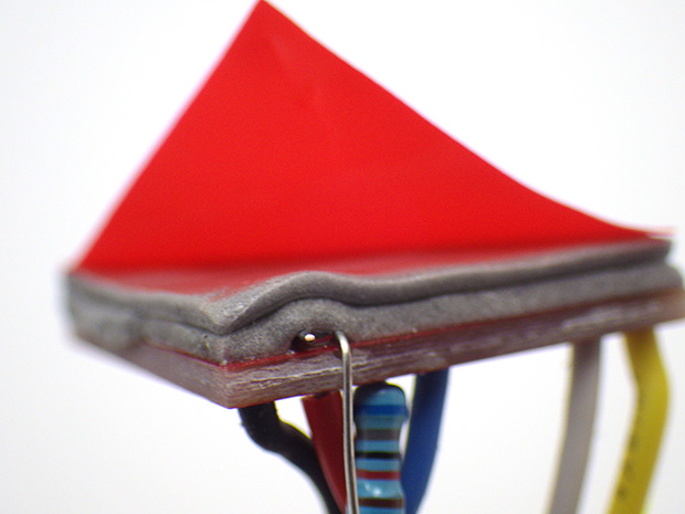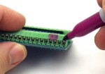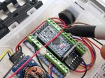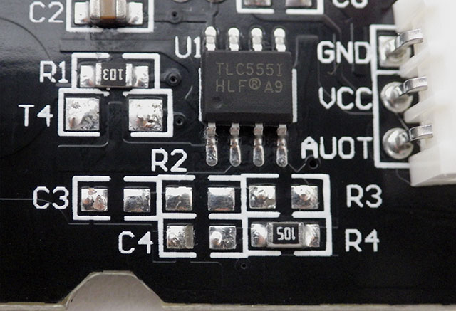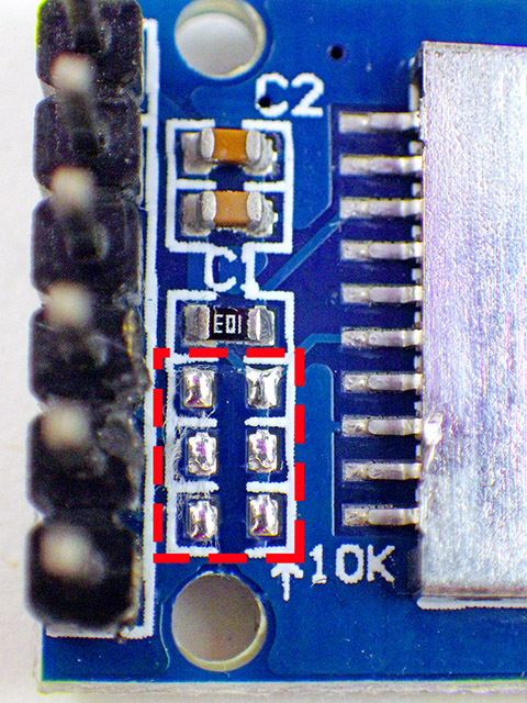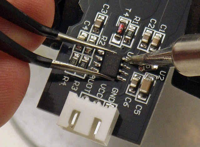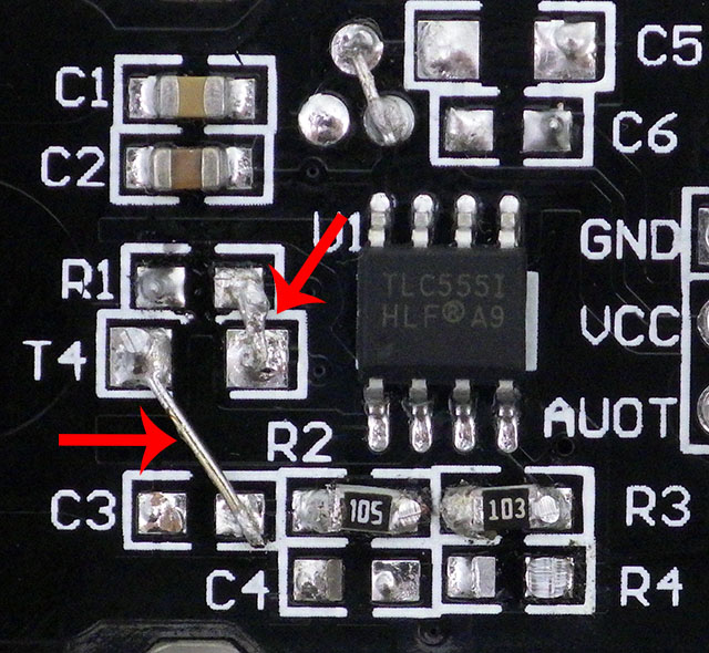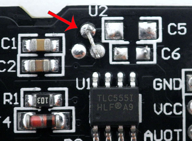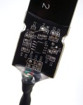 Here I disabled the LED by removing the limit resistor, set the mode to momentary low, and trimmed the header pins so the upper surface is flat. The unmarked solder pads on the upper right are were you would add trimming caps to reduce sensitivity. These switches self calibrate for 0.5 sec at startup, so they need a bit of ‘settling time’ at power-on.