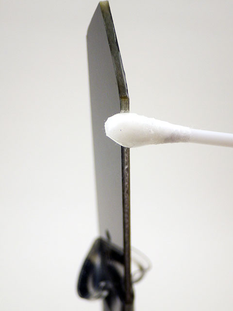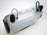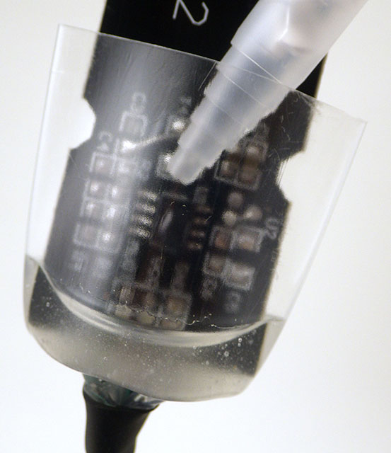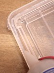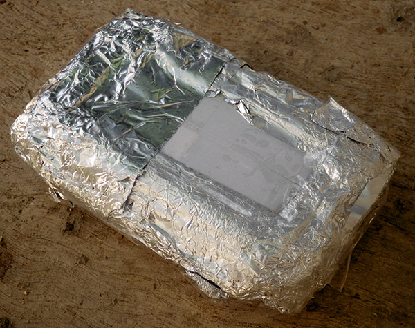With a tinfoil wrap, light can only enter through the 5 x 8cm exposure window above the LEDs. One layer of blank label-maker tape on the lid diffuses the light and prevents the plastic struts inside the housing from creating hot-spots. A final outer wrap of clear packing tape protects the tinfoil.