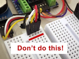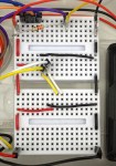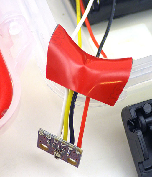 A small square of double sided tape holds the T233 inside the student build just above the batteries. (The outer most rows of the breadboards are power rails)