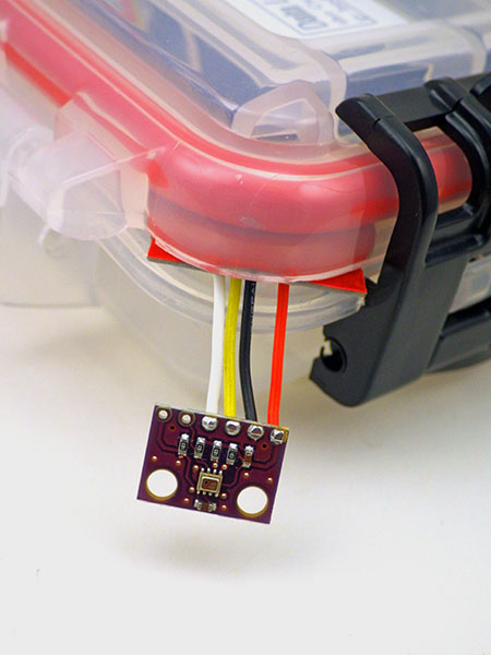 Both sensors are suspended on the inside of the logger housing with transparent Gorilla-brand mounting tape. Orange lines highlight areas where my deployment location suffers from unavoidable interference with the calibration, The light is reduced by passing through both the HDPE of housing lid & a glass window.