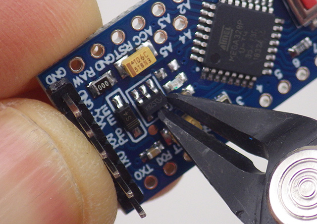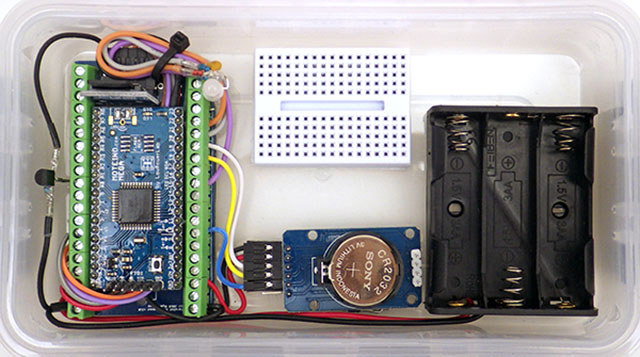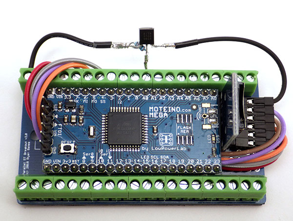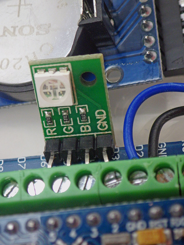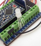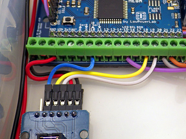 Note that the negative terminal of the IR LED is under the same screw terminal (D7) as the common cathode leg of the RGB indicator led. Columnating the LEDs with heat shrink tubing should also make them less sensitive to light reflections inside the logger.Note: our GitHub code uses a port command that assumes that shared ‘negative’ pin to be one ofD3 to D7 on the pro mini. Here I’ve set #define LED_GROUND_PIN 7 as the common GND connection, RED_PIN 6, GREEN_PIN 5, and the positive side of the IR led is on pin D8. Set #define BLUE_PIN 8 to force the former blue pin code to take the IR LED reading. Also note: that our code initially ‘lights’ the indicator LED via INPUT_PULLUP mode, instead of setting the pins to OUTPUT & HIGH, so limiting resistors are not necessary for that step.