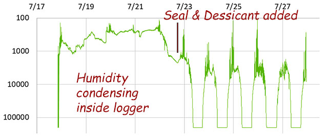 The most difficult lighting conditions to work with are partially cloudy days with many transitions from shadow to full sun. Because the reference and LED sensors are in different physical locations within the housing shadows that cross the loggeras the sun moves across the sky will darken one of the two sensors before the other if they are not aligned on the same north-to-south axis before your tests.