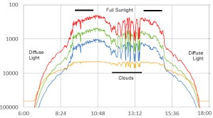 A note about the graphs shown below: I’m lucky to get one clear day per week my location, and the search for ‘the best’ LED light sensor will continue through the summer. I will update these plots with ‘cleaner’ runs as more data becomes available.