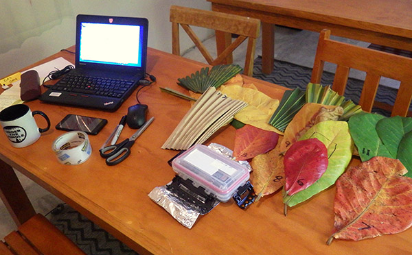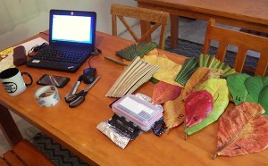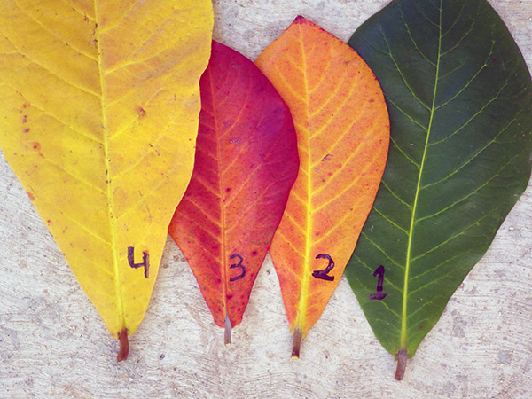 As luck would have it, this insight occurred just before another fieldwork trip, so it was more than a week before I could test the idea. The first trials used leaves from tropical almond trees which are dry-season deciduous. Re-capturing some of their ‘energetically expensive’ chlorophyll turns the leaves pinkish-red or yellow-brown due to the leftover pigments such as violaxanthin, lutein, and zeaxanthin. These Xanthophylls are yellow pigments from one of the two major divisions of the carotenoid group (the other division is formed by the carotenes). They act to modulate light energy and may also serve as a non-photochemical quenching agents to deal with excited states of chlorophyll that are overproduced during photosynthesis under the intense light conditions.