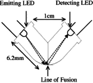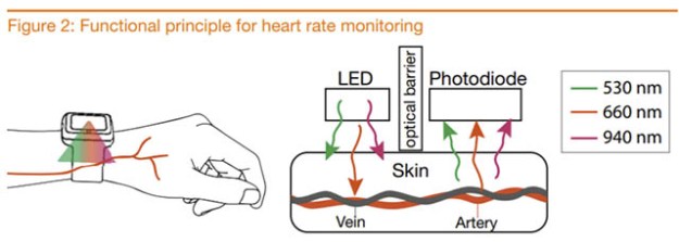 “The same procedure is used for oxygen saturation measurement. Here the principle is to measure the absorption of the hemoglobin in the blood. Oxygenated hemoglobin (HbO2) has a significantly different absorption of light than non-oxygenated hemoglobin (Hb). To detect this difference, the skin is illuminated with one red and one IR LED light and a photodetector measures the absorption.”