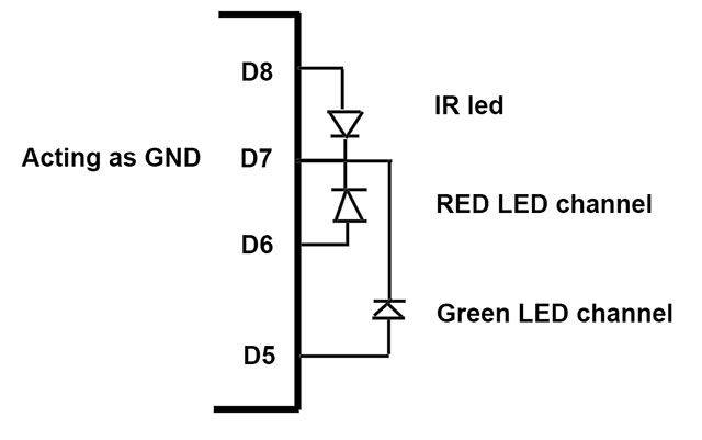 // discharge ALL channels by lighting them briefly before the reading digitalWrite(LED_GROUND_PIN,LOW);pinMode(LED_GROUND_PIN,OUTPUT); pinMode(BLUE_PIN,INPUT_PULLUP);pinMode(GREEN_PIN,INPUT_PULLUP); pinMode(RED_PIN,INPUT_PULLUP);