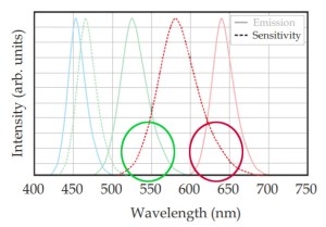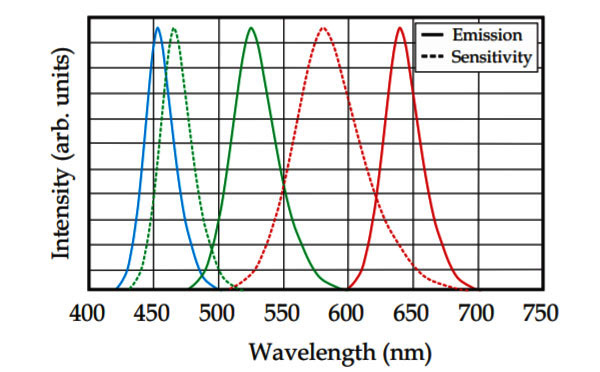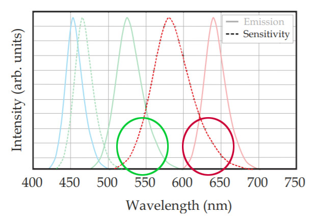 The overlap of the sub-LEDs at 550nm is leveraged for transmission (green) and photodetection (red) in short range visible light communications.